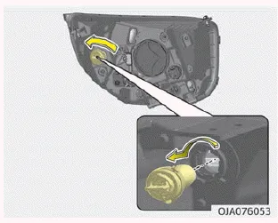 2. Entfernen Sie die Leuchtmittelfassung aus der Scheinwerferbaugruppe, indem Sie die Leuchtmittelfassung nach links drehen, bis die Nasen der Leuchtmittelfassung mit den Schlitzen der Scheinwerferbaugruppe übereinstimmen.