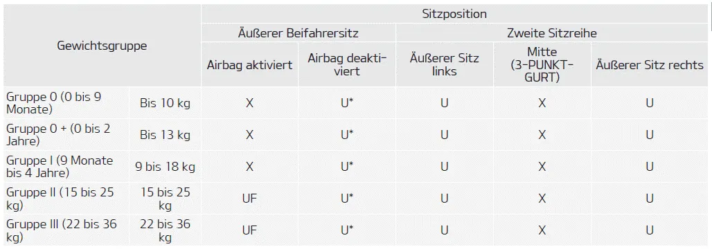 Verwenden Sie Kinderrückhaltesysteme, die offiziell zugelassen und für Ihre Kinder geeignet sind. Beachten Sie bei der Verwendung von Kinderrückhaltesystemen die folgende Tabelle: U = Geeignet für Kinderrückhaltesysteme der Kategorie „Universal“, die für diese Gewichtsgruppe zugelassen sind.