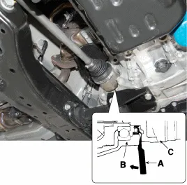 Einen Hebel (A) zwischen Getriebegehäuse (B) und Gelenkgehäuse (C) einführen und die Antriebswelle (A) vom Getriebegehäuse trennen.