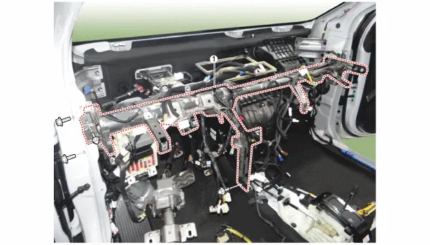 Bauteile und bauteile-Übersicht BAUTEILE-ÜBERSICHT 1. Untere mittlere Armaturenbrettverkleidung Reparaturverfahren AUS- UND EINBAU Handschuhe anziehen, um die Hände zu schützen.