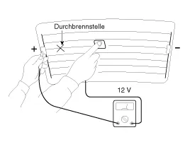 Heckscheibenheizungsschalter einschalten und mit einem Voltmeter die Spannung der einzelnen Heizleitungen im mittleren Bereich der Scheibe messen. Zeigt das Voltmeter 6 V an einem Leiter an, ist die Leitung zur Heckscheibe in gutem Zustand.