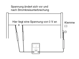 Zum Prüfen auf Stromkreisunterbrechungen, das Prüfkabel langsam in Richtung des Bereichs bewegen, in dem die Stromkreisunterbrechungen vermutet werden. Einen Punkt suchen, an die Spannung 0 V beträgt. Eine Unterbrechung ist an der Stelle, an der sich die Spannung ändert.