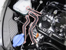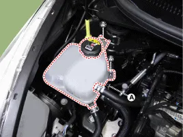 Ausgleichsbehälterschlauch (A) abtrennen und dann das Kühlmittel aus dem Ausgleichsbehälter ablassen. |