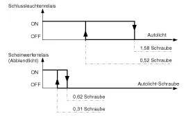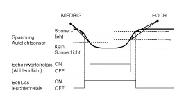 Wenn bei eingeschalteter Zündung (IGN1 ON) der Kombischalter erkennt, dass der Auto-Lichtschalter eingeschaltet ist, werden der Schlussleuchtenrelaisausgang und der Abblendlichtrelaisausgang entsprechend dem Eingang des Auto-Lichtsensors gesteuert. Die Auto-Lichtsteuerung funktioniert nicht, wenn bei der Sonnenlichtsensorstromversorgung (5 V geregelte Spannung von Zündung 1 zum Sonnenlichtsensor) ein Masseschluss vorliegt. Ist IGN1 eingeschaltet, überwacht das BCM den Bereich dieser Stromversorgung und setzt einen Fehlercode, wenn die Spannung der Stromversorgung außerhalb des Bereichs liegt. Dann tritt dieser Fehler auf und solange er nicht beseitigt wurde, wird der Scheinwerfer ohne Rücksicht auf die vom Sensor gelieferten Sonnenlichtdaten eingeschaltet. Damit soll verhindert werden, dass sich die Scheinwerfer ausschalten, wenn dieser Fehler bei Nacht auftritt.