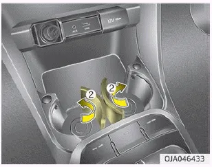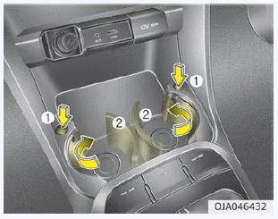 Wenn Sie den Becherhalterplatz als Stauraum nutzen wollen, drehen Sie die obere Hälfte des Becherhalters (2) in Pfeilrichtung.