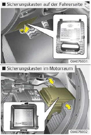 Die in diesem Handbuch abgedruckten Legenden für die Sicherungskästen beziehen sich auf den Zeitpunkt der Drucklegung. Möglicherweise treffen deshalb nicht alle Beschreibungen auf Ihr Fahrzeug zu. Wenn Sie einen Sicherungskasten in Ihrem Fahrzeug prüfen, richten Sie sich nach der Legende in dem jeweiligen Sicherungskastendeckel.