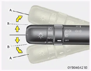 Betätigen Sie den Blinkerhebel zum Anzeigen eines Spurwechsels nur leicht, so dass er nicht einrastet, und halten Sie den Hebel fest (B). Nach dem Loslassen kehrt der Blinkerhebel in seine Ausgangsstellung zurück.