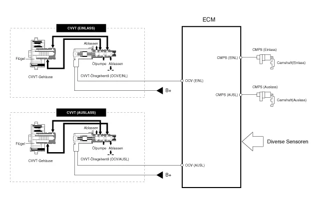 Die stufenlos verstellbare Ventilsteuerung (CVVT) verstellt die Ventilsteuerung von Einlass- und Auslassventil in Richtung 'früh' oder 'spät' gemäß dem ECM-Steuersignal, das anhand von Motordrehzahl und -last berechnet wird.