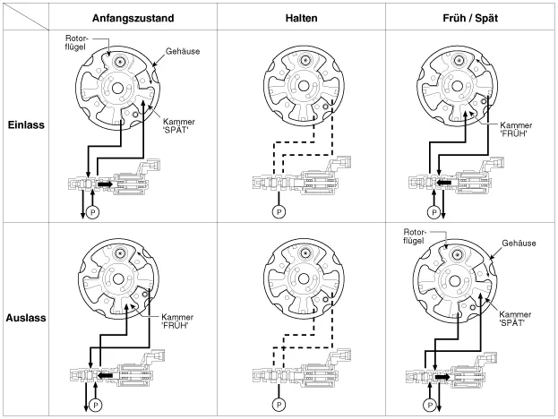 Das Motoröl, das durch das CVVT-Ölregelventil fließt, verstellt die Nockenwelle in Richtung (Einlass-In Richtung früh verstellen/Auslass-In Richtung spät verstellen) oder in entgegengesetzte Richtung (Einlass-In Richtung spät verstellen/Auslass-In Richtung früh verstellen) der Motordrehung, indem der Rotor gedreht wird, der an die Nockenwelle im Phasenwandler angeschlossen ist.