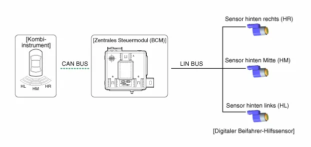 Das RPAS-System besteht aus vier RPAS-Sensoren, die Hindernisse erkennen und das Ergebnis getrennt nach drei Warnstufen (1./2./3.) über die LIN-Kommunikationsleitung an das BCM senden. Das BCM legt die Alarmstufe anhand der von den Slave-Sensoren übermittelten Meldungen fest und betätigt das akustische Signal oder überträgt die Daten an die Anzeige.