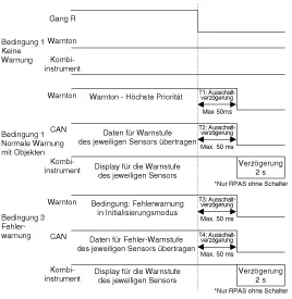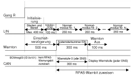 Wird ein Gegenstand vom RPAS-Sensor erfasst, wird eine akustische Warnung, z.B. mit einem Warnsummer ausgelöst. Der RPAS-Sensor sendet Daten über LIN-Kommunikation zum BCM; das BCM löst je nach Priorität einen Warnton für die einzelnen RPAS-SENSOREN aus. Wird ein Anzeige-Alarm an den Instrumentenblock gesendet, dient das BCM nur als Gateway.