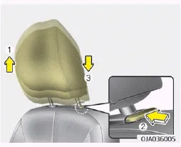 Um die Kopfstütze in eine höhere Stellung zu bringen, ziehen Sie bis in die gewünschte Stellung nach oben (1). Um die Kopfstütze in eine tiefere Stellung zu bringen, drücken Sie die Sperrtaste (2) an der Kopfstützenaufnahme, halten Sie die Taster gedrückt und drücken Sie dabei die Kopfstütze bis in die gewünschte Stellung nach unten (3).