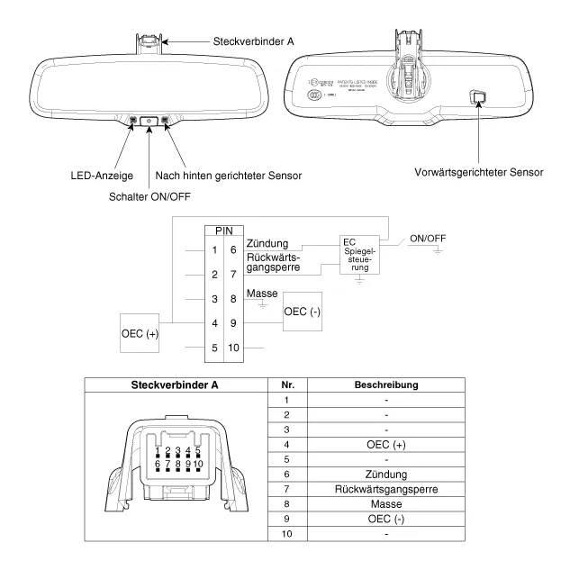 Der elektrochromatische Innenrückspiegel (ECM) dient dazu, das vom nachfolgenden Fahrzeug im Rückspiegel reflektierte Licht abzublenden. Der Sensor im Spiegel erfasst die Helligkeit. Wenn die Scheinwerfer vom nachfolgenden Fahrzeug im Spiegel reflektiert werden, reagiert eine chemische Schicht im Spiegel auf die Helligkeit und verändert die Reflektivität von 10 auf 70%. Beim Einlegen des Rückwärtsgangs wird der Spiegel unabhängig von der Umgebung hell. Das ECM empfängt Signale über Spannung, Masse und Rückwärts und verwendet zwei Sensoren, um Intensität der Blendung zu messen.