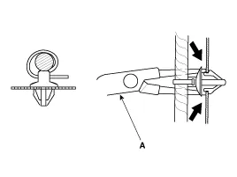 Eine Zange (A) unter den Clipsockel und schräg durch das Loch schieben, dann die Verlängerungslaschen zum Lösen des Clips zusammendrücken.