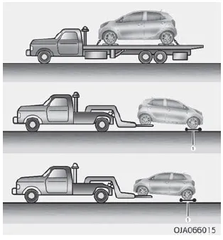 Wenn in einem Notfall Abschleppen erforderlich ist, wird empfohlen, dies von einem Kia-Vertragshändler oder einem gewerblichen Abschleppdienst machen zu lassen. Um Schäden am Fahrzeug zu vermeiden, müssen geeignete und fachgerechte Abschleppverfahren angewendet werden. Es wird empfohlen, Nachläufer (1) oder einen Pritschenwagen zu verwenden.