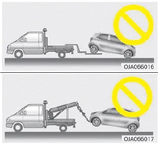 Wenn das Fahrzeug von einem gewerblichen Abschleppfahrzeug abgeschleppt wird und keine Nachläufer verwendet werden, sollten immer die Vorderräder, nicht die Hinterräder, vom Boden angehoben sein.