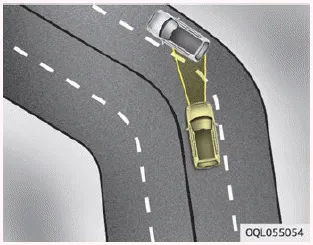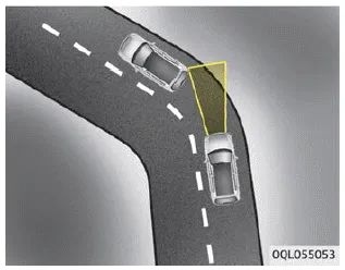 Beim Befahren einer Kurve ist die Leistung des AEB eingeschränkt. Das AEB erkennt das vorausfahrende Fahrzeug möglicherweise nicht, selbst wenn dieses auf derselben Fahrspur fährt. Möglicherweise werden grundlos Warnmeldungen und Warnsignale erzeugt, und möglicherweise werden überhaupt keine Warnmeldungen und Warnsignale erzeugt. Fahren Sie in Kurven besonders vorsichtig, und betätigen Sie bei Bedarf das Bremspedal.
