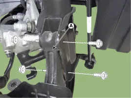Reparaturverfahren Ausbau 1. Vorder-/Hinterrad (A) abmontieren. Anzugsdrehmoment. 107,9 ~ 127,5 Nm (11,0 ~ 13,0 kgm) Hierbei darauf achten, dass die Radmuttern beim Abnehmen von Vorderrad und -reifen nicht beschädigt werden.