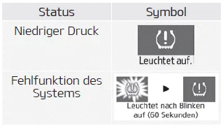 Die Warnleuchte ( ) leuchtet auf, wenn ein Reifen mit zu niedrigem Druck erkannt wird. Bei bestimmten Fahrzeugtypen wird die oben genannte Meldung im Kombiinstrument angezeigt.
