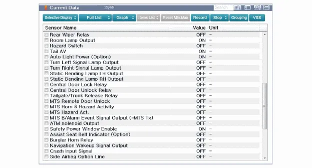 Defekte Komponenten der Karosserieelektrik können schnell mit dem Fahrzeugdiagnosesystem (KDS/GDS) untersucht werden. Das Diagnosesystem (KDS/GDS) liefert die folgenden Informationen.