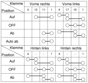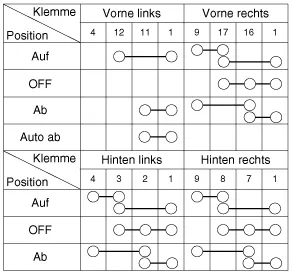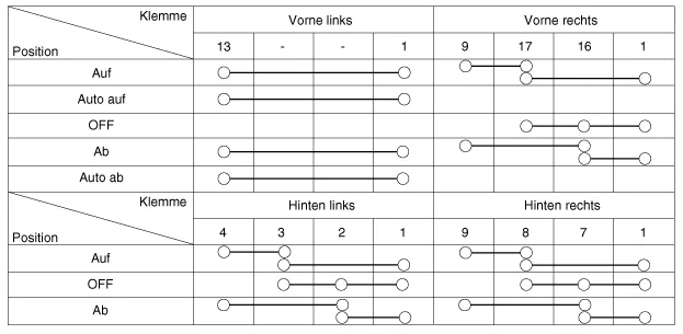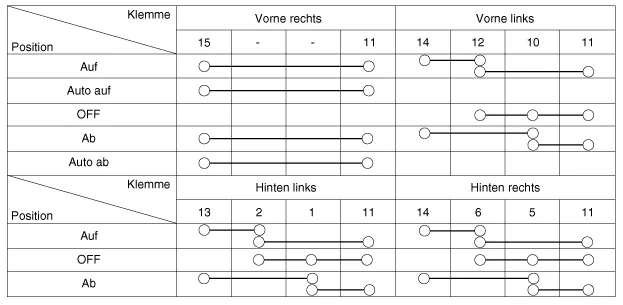 In den einzelnen Schalterstellungen gemäß der folgenden Tabelle auf Durchgang zwischen den Klemmen prüfen. Wenn der Stromdurchgang nicht vorschriftsgemäß ist, den Schalter ersetzen. [Alle Manuell / Automatisches Öffnen] (Linkslenkung)