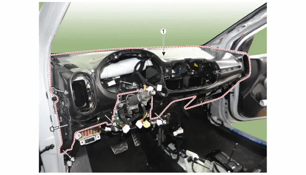 Bauteile und bauteile-Übersicht BAUTEILE-ÜBERSICHT 1. Untere mittlere Armaturenbrettverkleidung Reparaturverfahren AUS- UND EINBAU Handschuhe anziehen, um die Hände zu schützen.