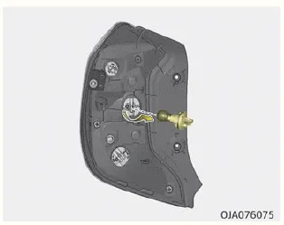 6. Entnehmen Sie die Glühlampe aus der Fassung, indem Sie die Glühlampe niederdrücken und gegen den Uhrzeigersinn drehen, bis ihre Rastnasen zu den Aussparungen in der Lampenfassung ausgerichtet sind. Ziehen Sie die Glühlampe aus der Fassung.