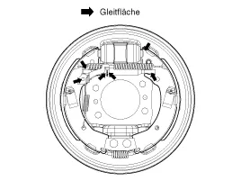 Bremszylinderfett oder ein gleichwertiges Gummifett auf die dargestellten Gleitflächen auftragen. Darauf achten, dass kein Fett auf die Bremsbeläge kommt.