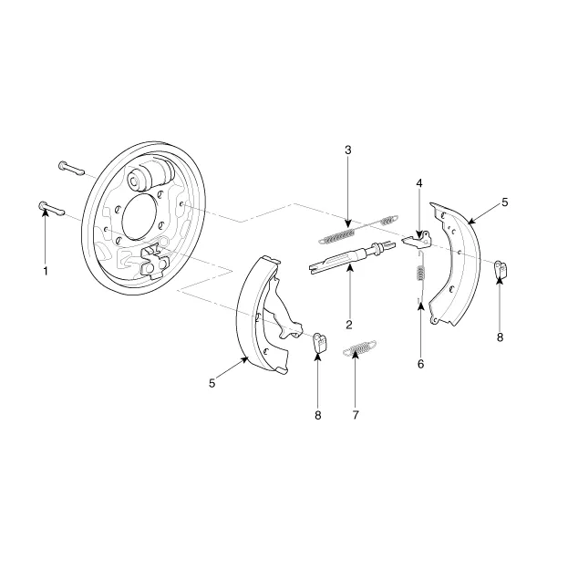 5. Bremsbacke 6. Einstellen der Feder 7. Untere Rückholfeder 8. Backenhaltefeder |