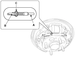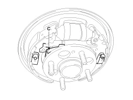 Bremsbacken (C) an der Trägerplatte anbauen. Darauf achten, dass die Radzylinderschutzkappen nicht beschädigt werden.