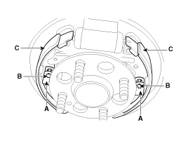 Backenhaltefedern (A) und Backenhaltestifte (B) ausbauen, dann die Bremsbacke entfernen (C). Sicherstellen, dass die Staubschutzkappe am Radzylinder nicht beschädigt wird.