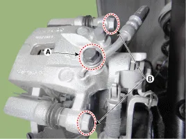 Ösenschraube (A) und Führungsschrauben (B) lösen, dann das Bremssattelgehäuse ausbauen.