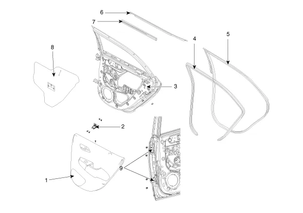 7. Inneres Dichtungsprofil an Hintertürfensterschacht 8. Hintertürverkleidungsdichtung 9. Hintertürscharnier |