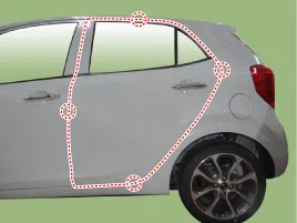 Nach dem Einbau überprüfen, ob die Tür bündig mit den daneben liegenden Karosserieblechen abschließt, dann auf gleiche Abstände zwischen vorderen, hinteren und unteren Kanten sowie der Karosserie prüfen. Sicherstellen, dass Tür- und Rahmenkanten parallel verlaufen. Vor dem Einstellen Befestigungsschrauben ersetzen. |