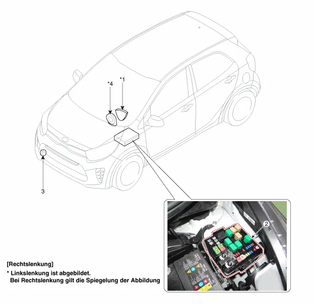 Das Relais für die Hupe dieses Fahrzeugs ist in den Motorraum-Relaiskasten integriert. |