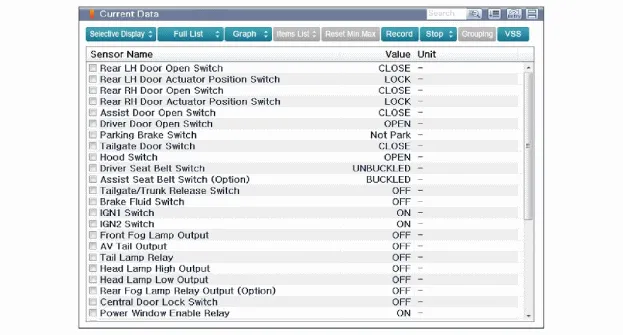 Zur Abfrage des momentanen Eingangs-/Ausgangswerts des Innenraum-Sicherungskastens die "Momentanen DATEN" überprüfen. Hier wird der Eingangs-/Ausgangsstatus des Innenraum-Sicherungsblocks angezeigt.