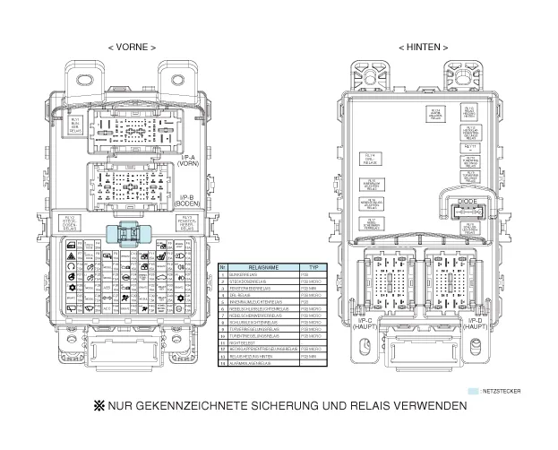 Die Diagnose des Innenraum-Sicherungskastens kann mit dem KDS/GDS durchgeführt werden. Der Innenraum-Sicherungskasten kommuniziert mit dem KDS/GDS, welches dann die Ein- und Ausgangssignale mit Codes anzeigt. |