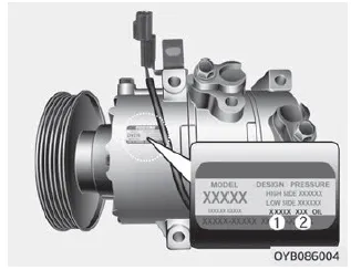 Die Kennzeichnung des Klimaanlagenkompressors enthält Informationen über die Art des Kompressors, mit dem Ihr Fahrzeug ausgestattet ist, d. h. Modell, Herstellerartikelnummer, Produktionsnummer, Kältemittel (1) und Kältemittelöl (2).