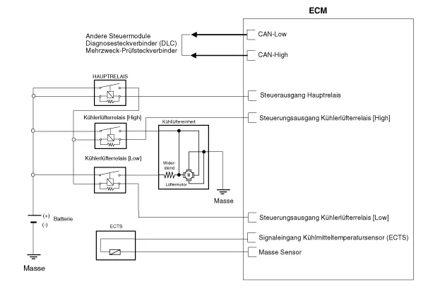 Der Kühlerlüfter arbeitet in 2 Stufen (HIGH/LOW). Das Motorsteuermodul (ECM) steuert den Kühlerlüfter entsprechend Kühlmitteltemperatur, Fahrzeuggeschwindigkeit und Betrieb der Klimaanlage.