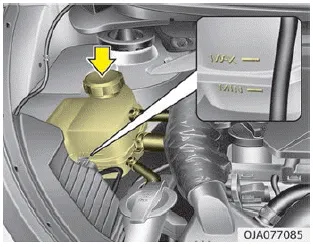 Wenn der Kühlmittelstand zu niedrig ist, füllen Sie ausreichend destilliertes (deionisiertes) Wasser auf. Bringen Sie den Kühlmittelstand auf MAX, befüllen Sie das System jedoch nicht übermäßig. Wenn häufig Öl nachgefüllt werden muss, lassen Sie die Anlage von einer Fachwerkstatt überprüfen. Kia empfiehlt den Besuch eines Kia-Händlers/ Servicepartners.