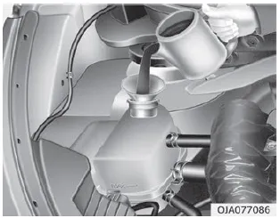 Lassen Sie das Kühlmittel von einer Fachwerkstatt austauschen. Kia empfiehlt den Besuch eines Kia-Händlers/ Servicepartners. ACHTUNG Legen Sie vor dem Auffüllen des Motorkühlmittels ein dickes Tuch um den Kühlerverschlussdeckel, um zu vermeiden, dass Kühlmittel auf Motorteile, z.