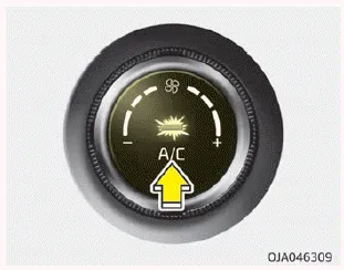 Drücken Sie die Taste A/C, um die Klimaanlage einzuschalten. Die Kontrollleuchte im Schalter leuchtet bei eingeschalteter Klimaanlage auf.