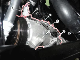 Kompressorkupplungssteckverbinder (A) abziehen. Danach die Befestigungsschrauben lösen und den Kompressor (B) ausbauen.