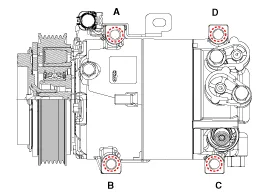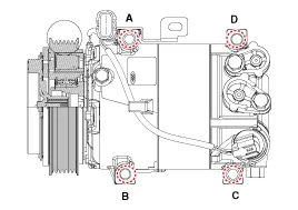Sicherstellen, dass die Kompressor-Befestigungsschrauben die korrekte Länge aufweisen, dann in der Reihenfolge A?B?C?D festziehen.