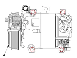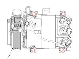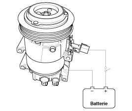 Funktion der Magnetkupplung überprüfen. Die seitlichen Anschlussklemmen des Kompressors am Batterie-Pluspol (+) anschließen und den Batterie-Masseanschluss (-) am Kompressorgehäuse anschließen. Betriebsgeräusch der Magnetkupplung überprüfen, um deren Zustand zu kontrollieren.
