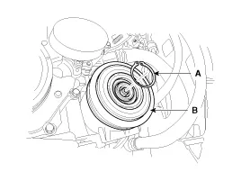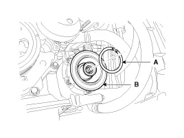 Sicherungsring (A) entfernen und dann Riemenscheibe (B) ausbauen.