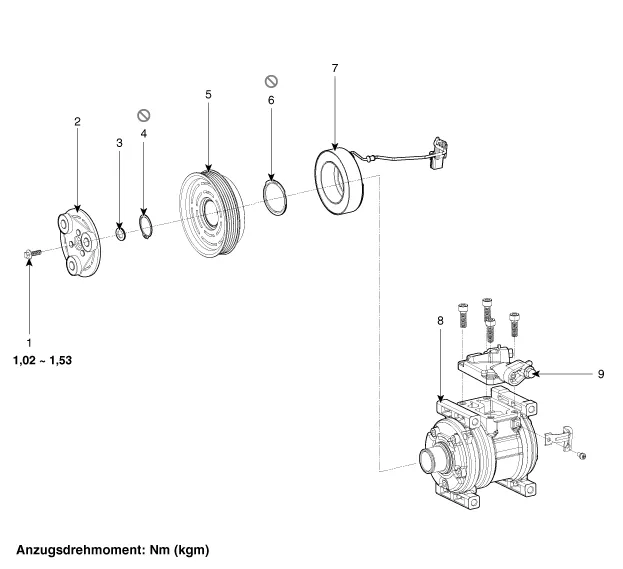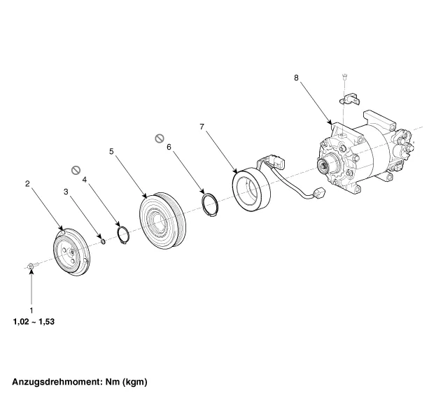 Kompressorkupplung wieder zusammenbauen (in umgekehrter Reihenfolge der Zerlegung); dabei auf Folgendes achten: