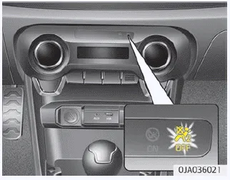 Wenn der EIN/AUS-Schalter des Beifahrer- Frontairbags nicht ordnungsgemäß funktioniert, leuchtet die Kontrollleuchte „Beifahrer-Frontairbag AUS“ nicht auf (die Kontrollleuchte „Beifahrer-Frontairbag EIN“ leuchtet auf und erlischt nach ungefähr 60 Sekunden), und der Beifahrer- Frontairbag wird bei einem Frontaufprall aktiviert, selbst wenn der EIN/AUS-Schalter des Beifahrer- Frontairbags in die Position AUS geschaltet ist.