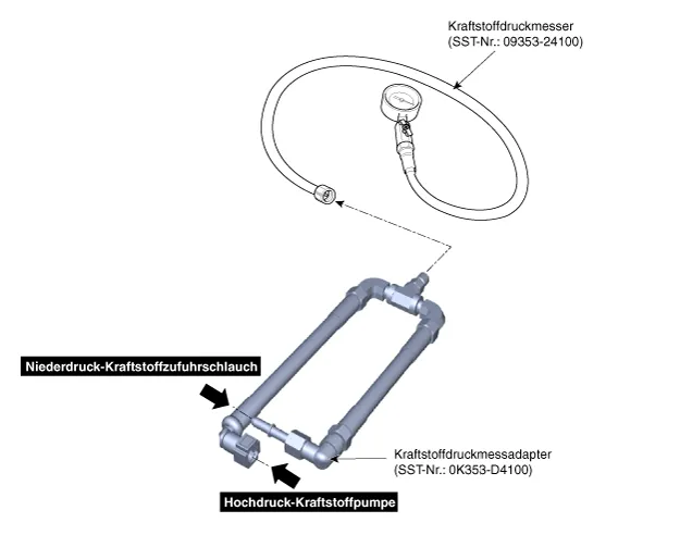An den Anschlüssen entlang der Kraftstoffzufuhrleitung, der Förderleitung und den SST-Komponenten bei eingeschalteter Zündung auf Kraftstoffundichtigkeit prüfen. |