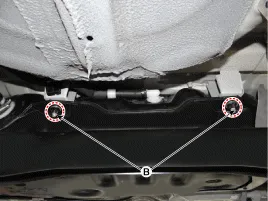 Befestigungsschraube (A) und -mutter (B) des Kraftstofftanks entfernen.
